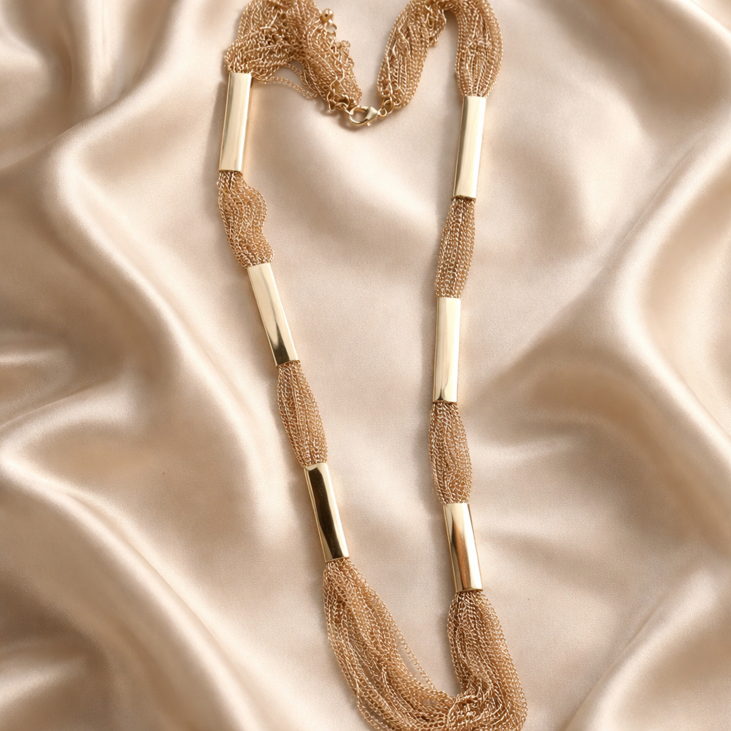 - La collana skin è una collana multifili lunga, versatile. Può essere indossata come girocollo. I fili sono sottilissimi e realizzati in maglia ottone.